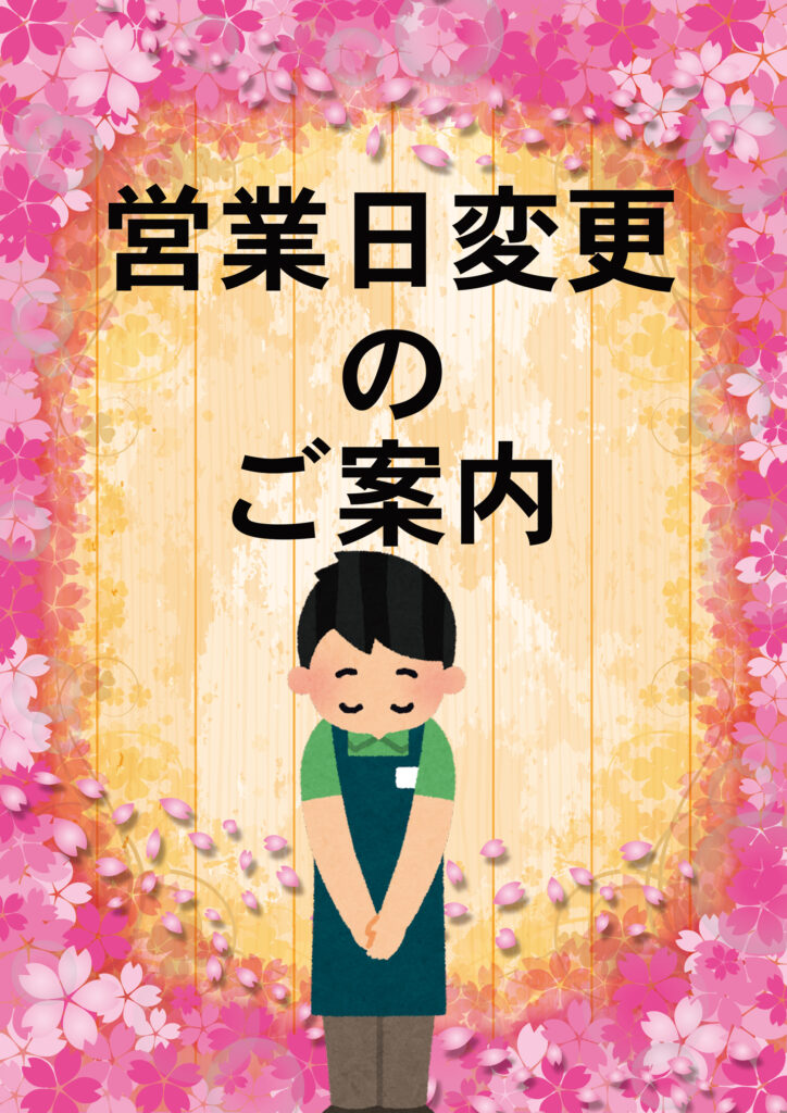☆営業日変更の案内☆お知らせ / By 村長 / 2023年3月21日 2023年3月21日 ☆営業日変更のご案内☆ honoboの村は 「飲食店等感染防止徹底点検済認証店」です honoboの村は大型連休などを除き営業日を土曜・日曜・祝日とさせていただきます。平日のご利用のお客様はお気軽にご相談ください。