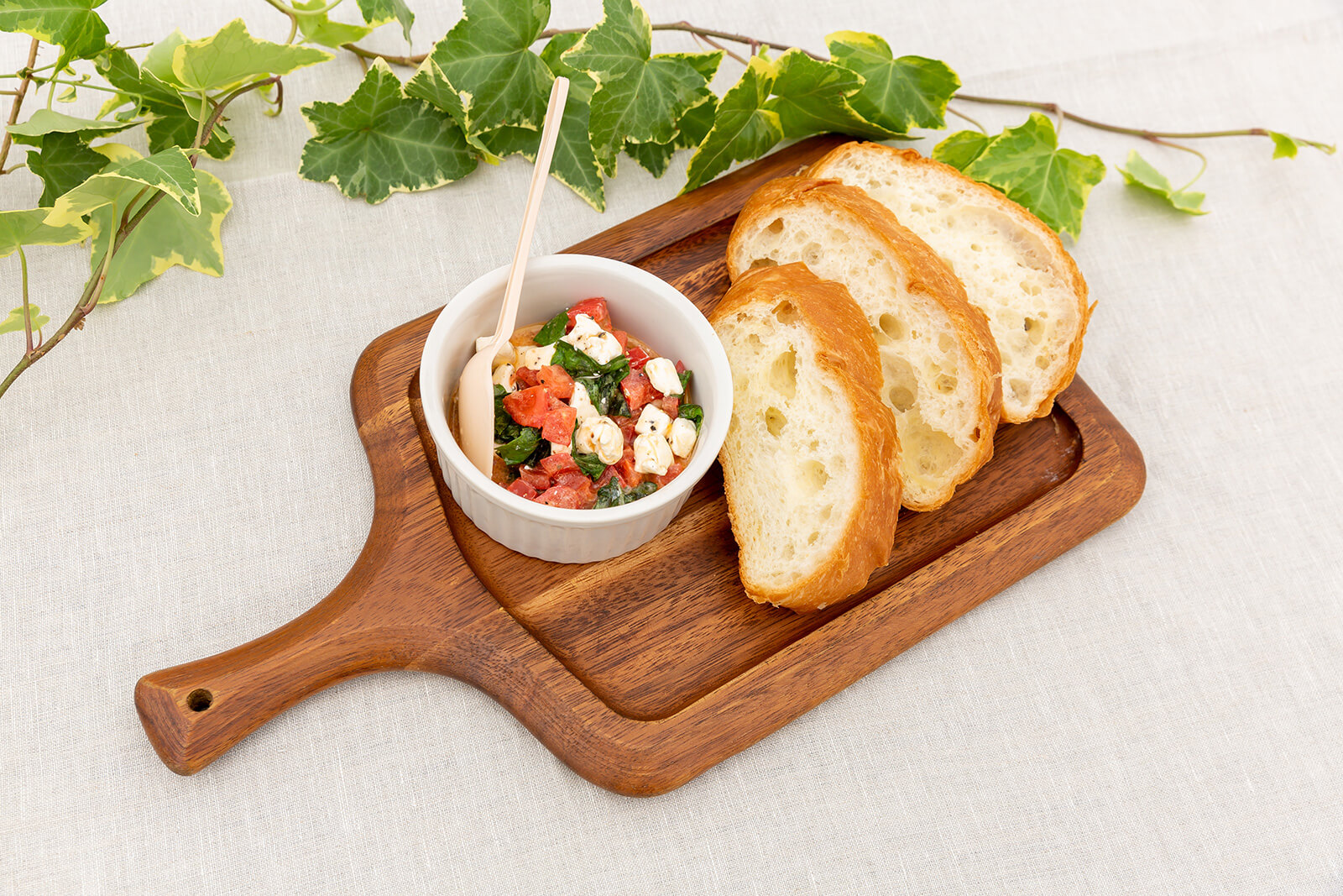 パンをグリルでこんがり焼いき、パンの上にトマト、クリームチーズ、バジルをのせてお召し上がりください。